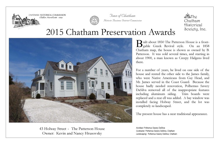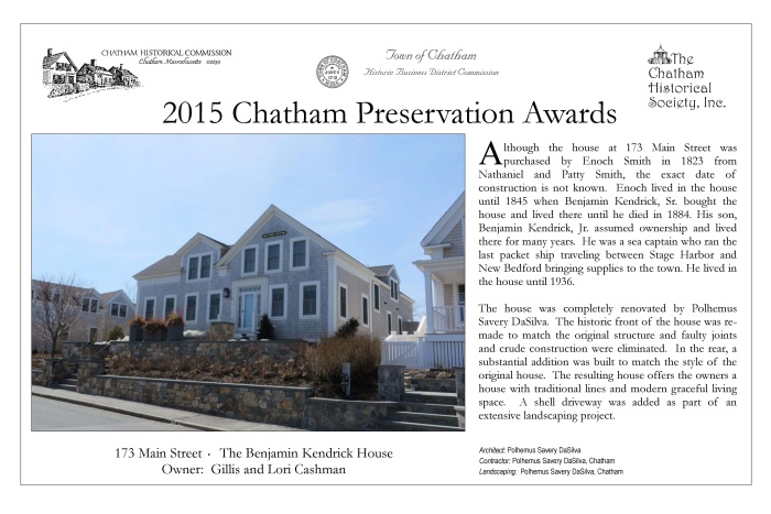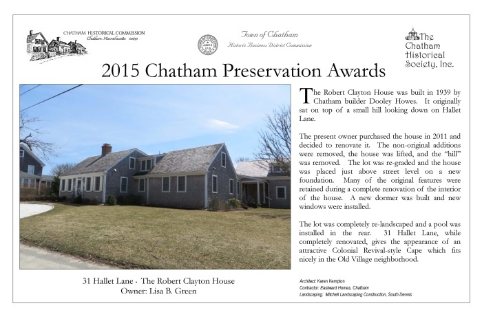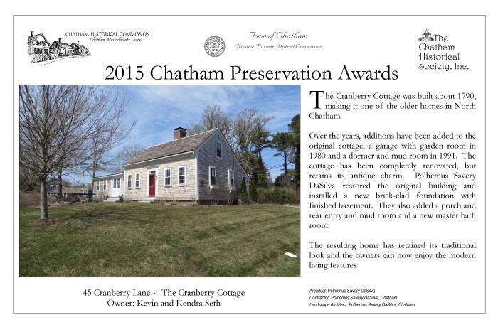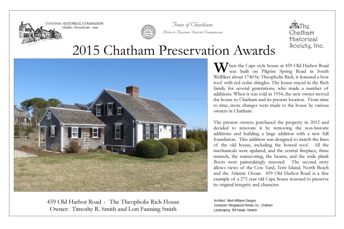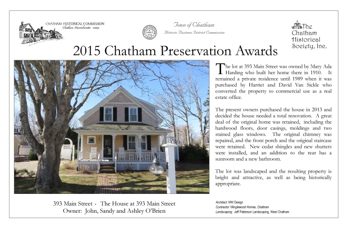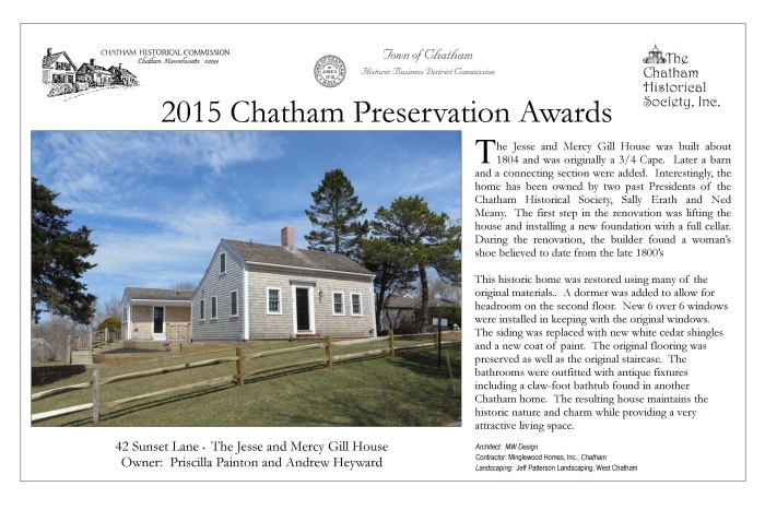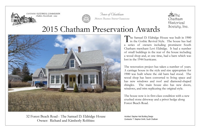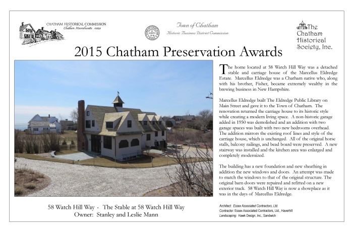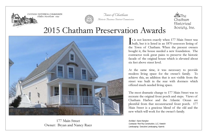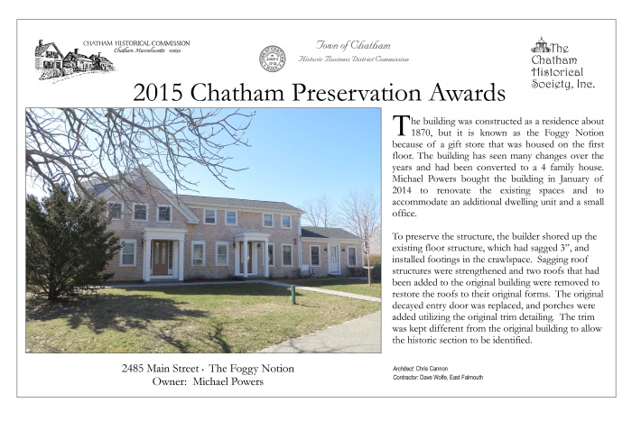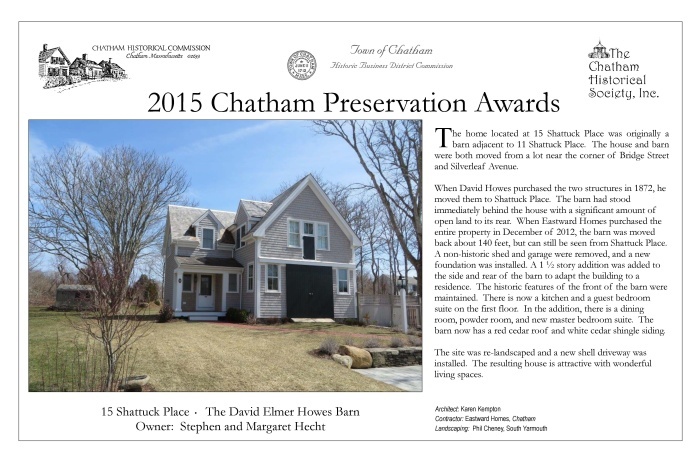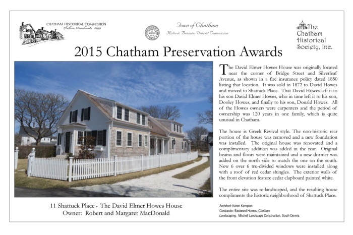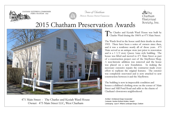 In May 2015, award plaques were presented to fourteen winners of 2015 Chatham Preservation Awards. These plaques are reproduced below.