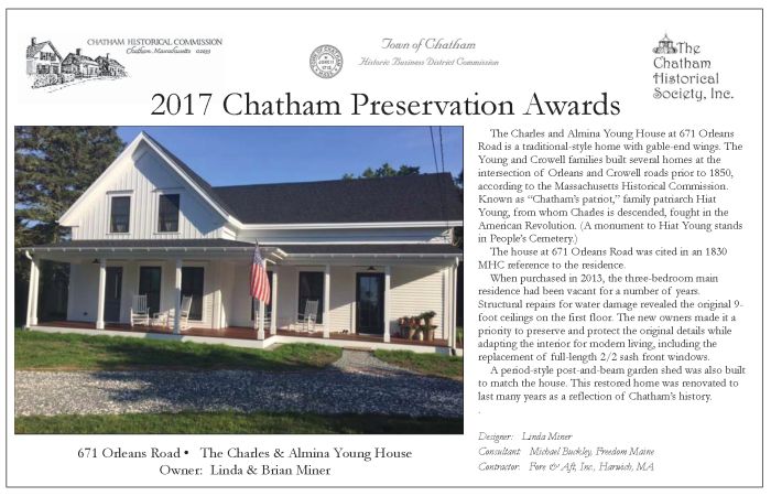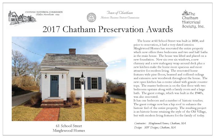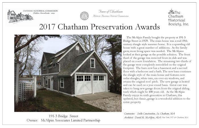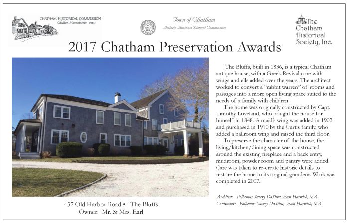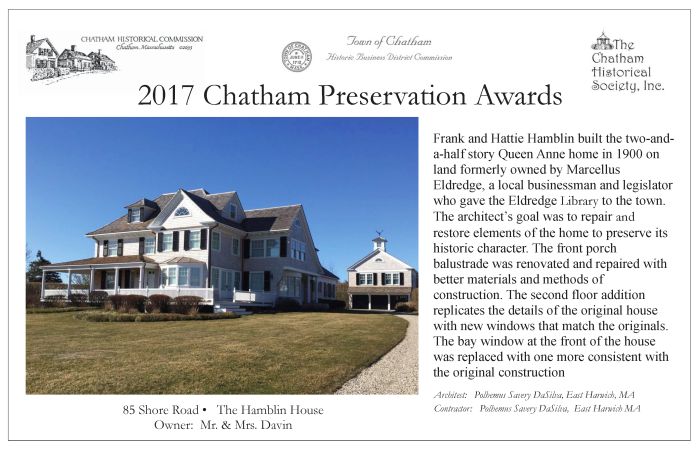 In May 2017, award plaques were presented to six winners of 2017 Chatham Preservation Awards. These plaques are reproduced below.