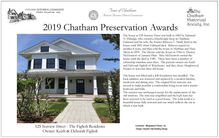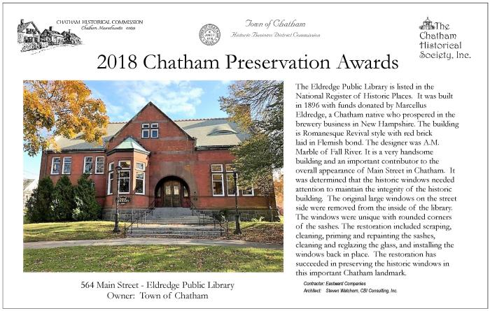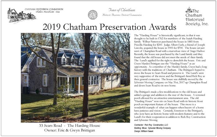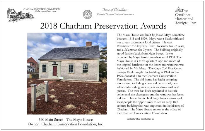In May 2019, award plaques were presented to three winners of 2018 Chatham Preservation Awards, and two winners for 2019. These plaques are reproduced below.